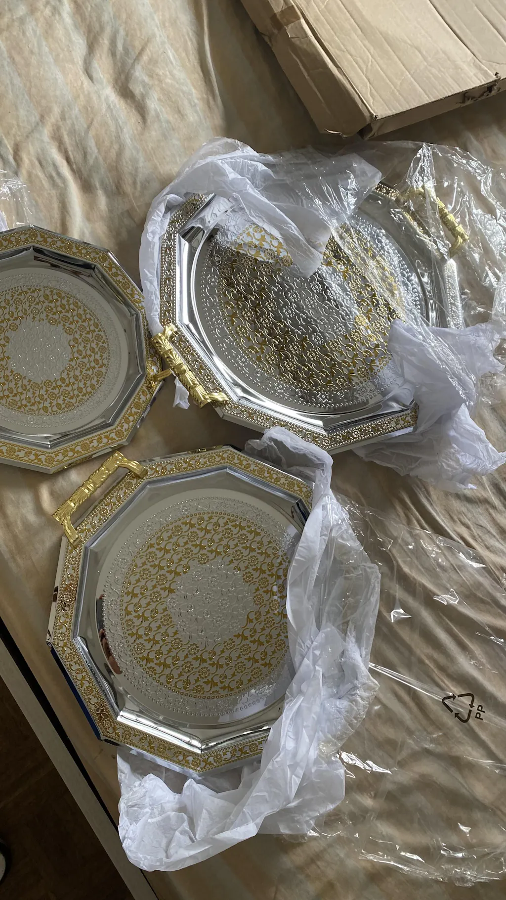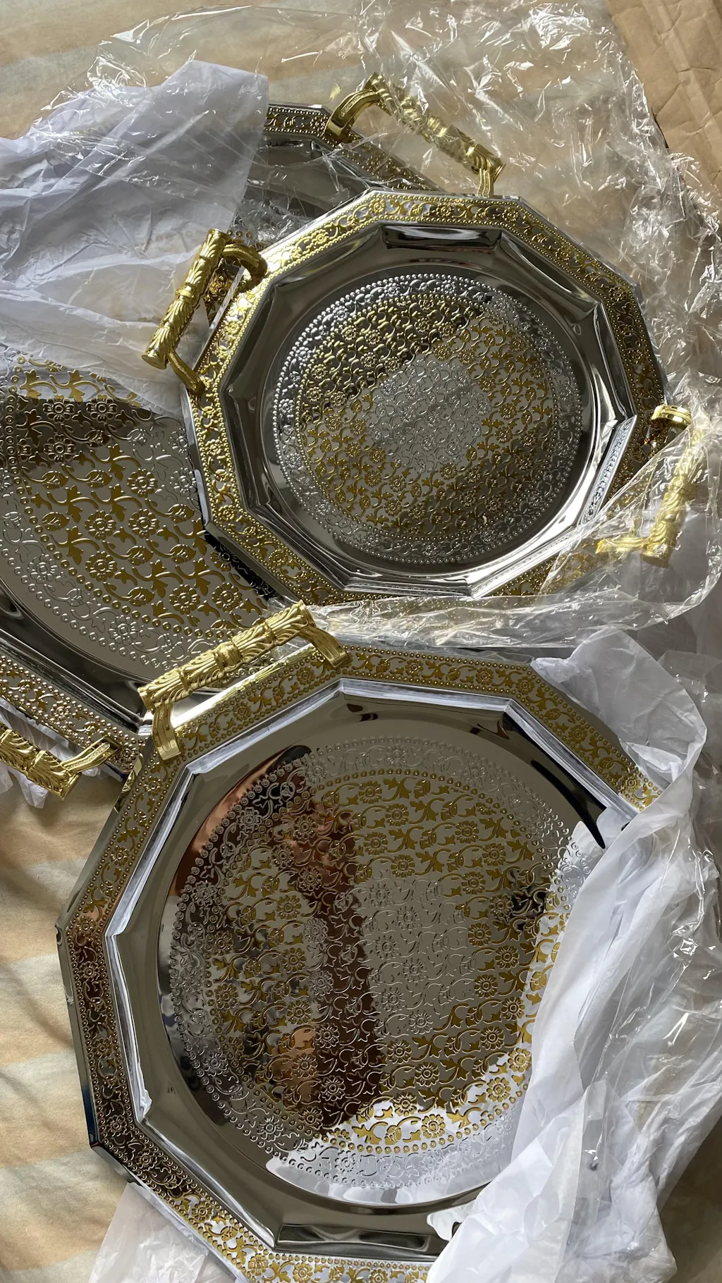 طقم سينيا مكون من 3 صواني ذهبية مصنوعة من مواد عالية الجودة. سطحها مقاوم وناعم، بينما الجزء السفلي من الصواني مزود بأخاديد غير قابلة للانزلاق تضمن الثبات. هذه الصواني مصنوعة بلمسة نهائية ذهبية فاخرة، وهي مثالية لحمل الطعام والمقبلات والحلويات.