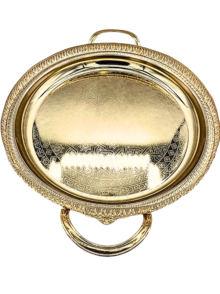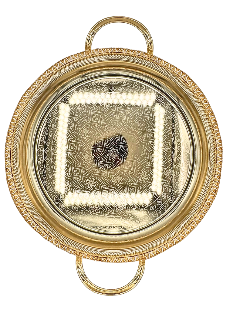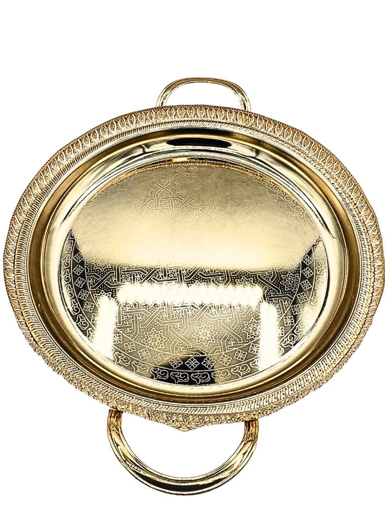 Vassoio tradizionale marocchino realizzato con artigianato autentico, perfetto per servire il tè con stile e eleganza. Questo pezzo caratteristico presenta dettagli decorativi intricati e una finitura rifinita a mano che riflette la ricca eredità culturale marocchina. Ideale per chi apprezza l'autenticità e desidera aggiungere un tocco esotico alla propria tavola. Un accessorio versatile che combina funzionalità e bellezza, adatto sia per l'uso quotidiano che per occasioni speciali.