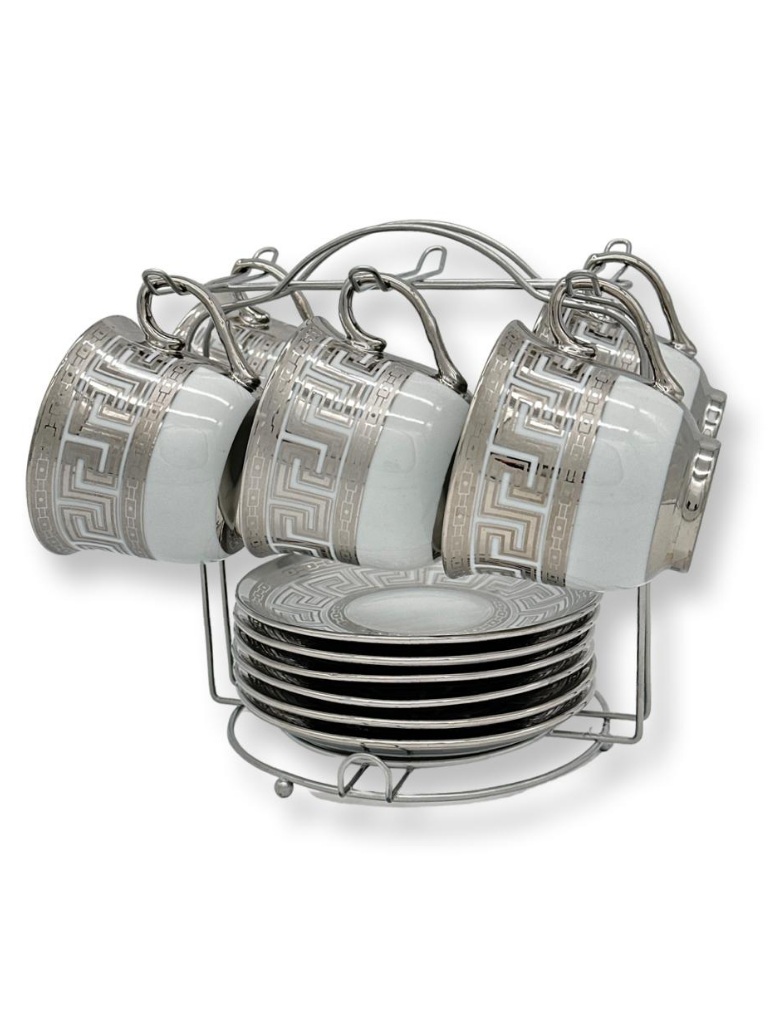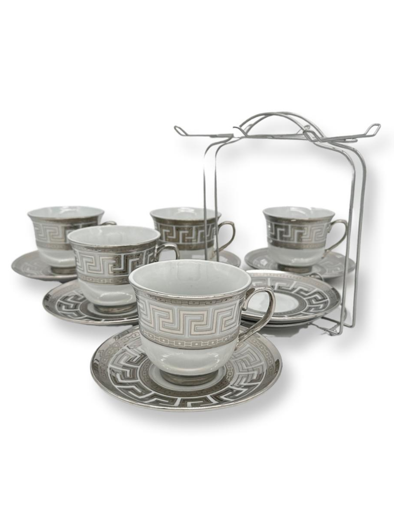 Il set è completo di un pratico supporto in metallo cromato che consente di riporre ordinatamente le tazze e i piattini, ottimizzando lo spazio e aggiungendo un tocco decorativo alla cucina o al soggiorno.