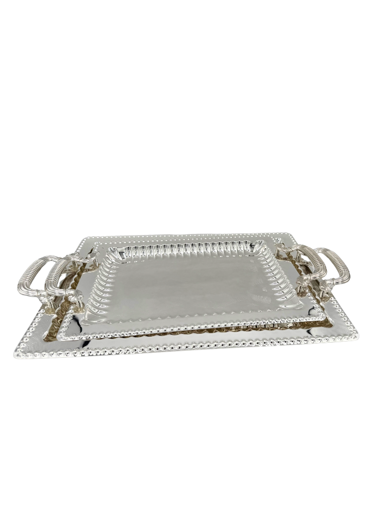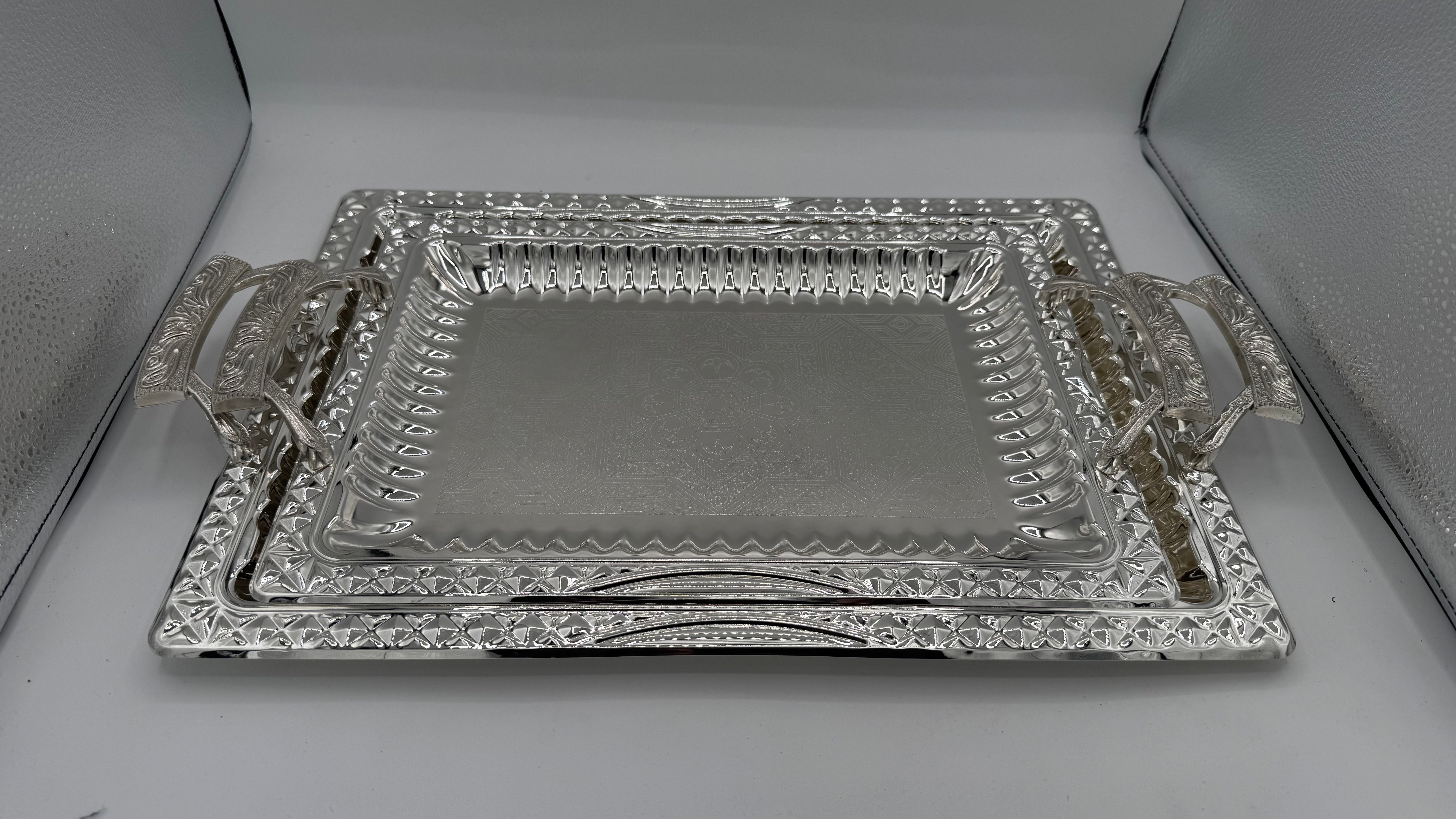 Elegante set di due vassoi siniya in acciaio inossidabile con finitura argento dorato, perfetti per servire con stile. Il design arabo raffinato trasforma ogni momento conviviale in un'esperienza sofisticata. Ideali per portate, dolci e frutta, questi vassoi combinano funzionalità e bellezza estetica. La costruzione robusta garantisce durabilità nel tempo, mentre il materiale di qualità facilita la pulizia. Un'aggiunta preziosa per chi apprezza l'artigianato tradizionale e desidera elevare la propria tavola con un tocco di eleganza orientale autentica.